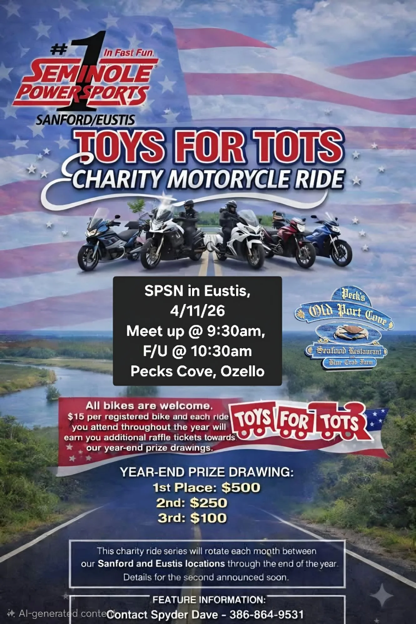 The 2nd of the 10 Toys for Tots group ryde. If you plan to attend the meet up this month as at 9:30 am at Seminole PowerSports North, 15821 US-441, Eustis, FL, feet up at 10:30. There is a $15 entry fee for each rider with every single dollar going to Toys for Tots. Each ride you attend will get you a raffle ticket for a end of year drawing for priaes.