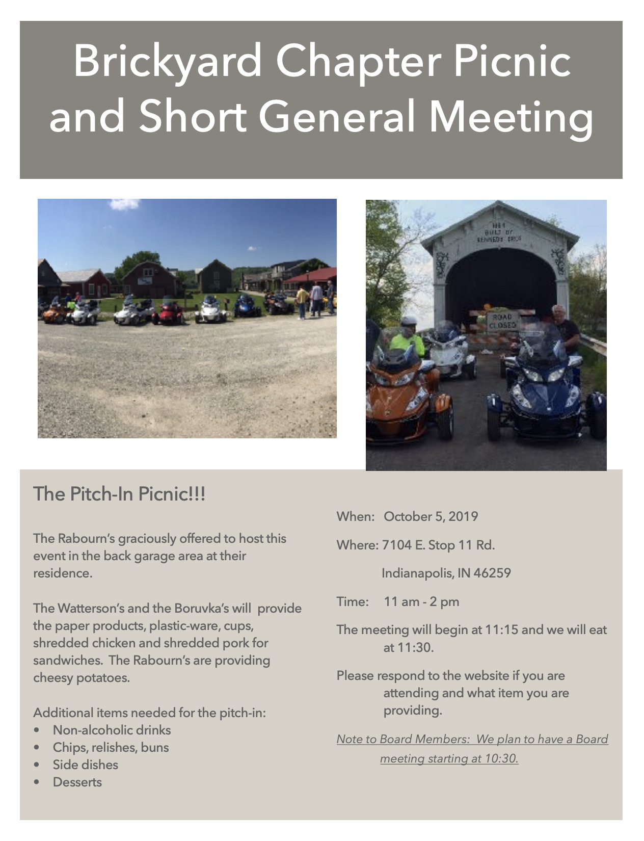 Chapter Meeting & Picnic - October 5, 2019 Chapter Meeting & Picnic - October 5, 2019 View fullsize Newer:Spyder Adventures - October 10-12, 2019Older:Lake Barkley Spyder Ride - October 4, 2019 PostedOctober 5, 2019 AuthorJames Gerdes CategoriesChapter Tags2019