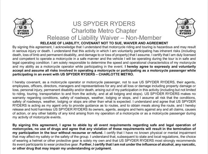 To join US SPYDER RYDERS - CHARLOTTE METRO CHAPTER read and understand the Chapter Bylaws, Release of Liability Waiver–Member and the COVID-19 Safety Acknowledgement Waiver documents below. Then, complete the online Membership Application, by which you acknowledge acceptance of the terms of each of these three documents.