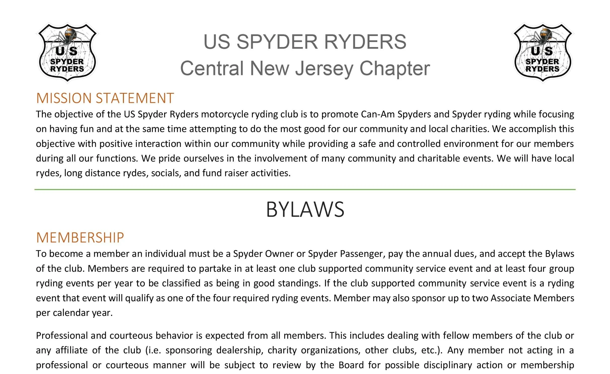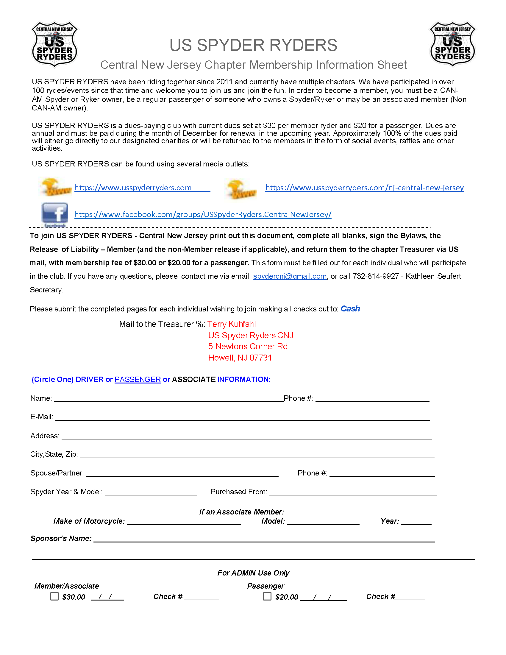 To join US SPYDER RYDERS CENTRAL NEW JERSEY CHAPTER print out and complete Membership Sign-up, Club Bylaws, and Release of Liability–Member. Submit completed forms with your dues. This must be done for each individual who will participate in the club.