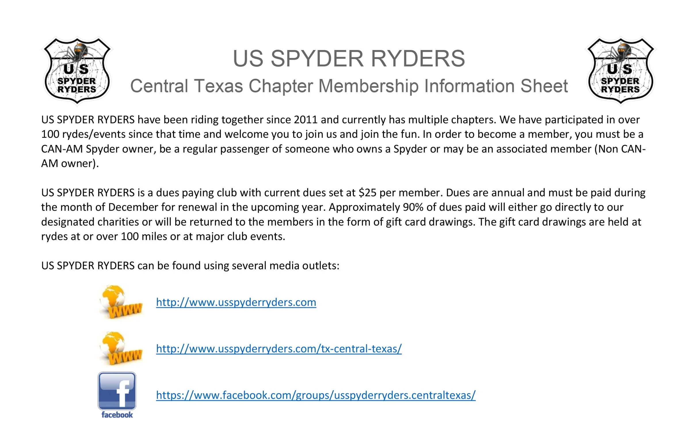 To join US SPYDER RYDERS - CENTRAL TEXAS CHAPTER print out and complete Membership Information Sheet, Chapter Bylaws, and Release of Liability–Member. Submit completed forms with your dues. This must be done for each individual who will participate in the club.